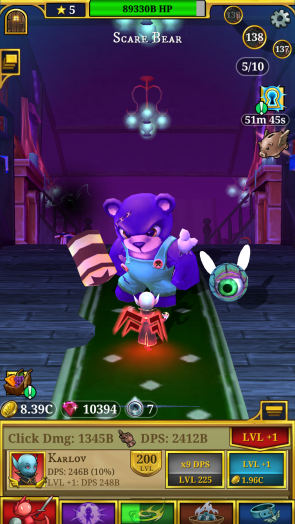 Apparently, while I was ‘gone’, KingsIsle came out with a new mobile game called EverClicker. It’s like a clicky kind of RPG with an exciting story (defeat the evil Star Devourer, oohhhh) and pretty fun play mechanic, clicking to defeat bad guys and upgrading your ‘team’ to deal more and more damage as the enemies get bigger and tougher, culminating in a pretty big boss fight every 5 levels.
